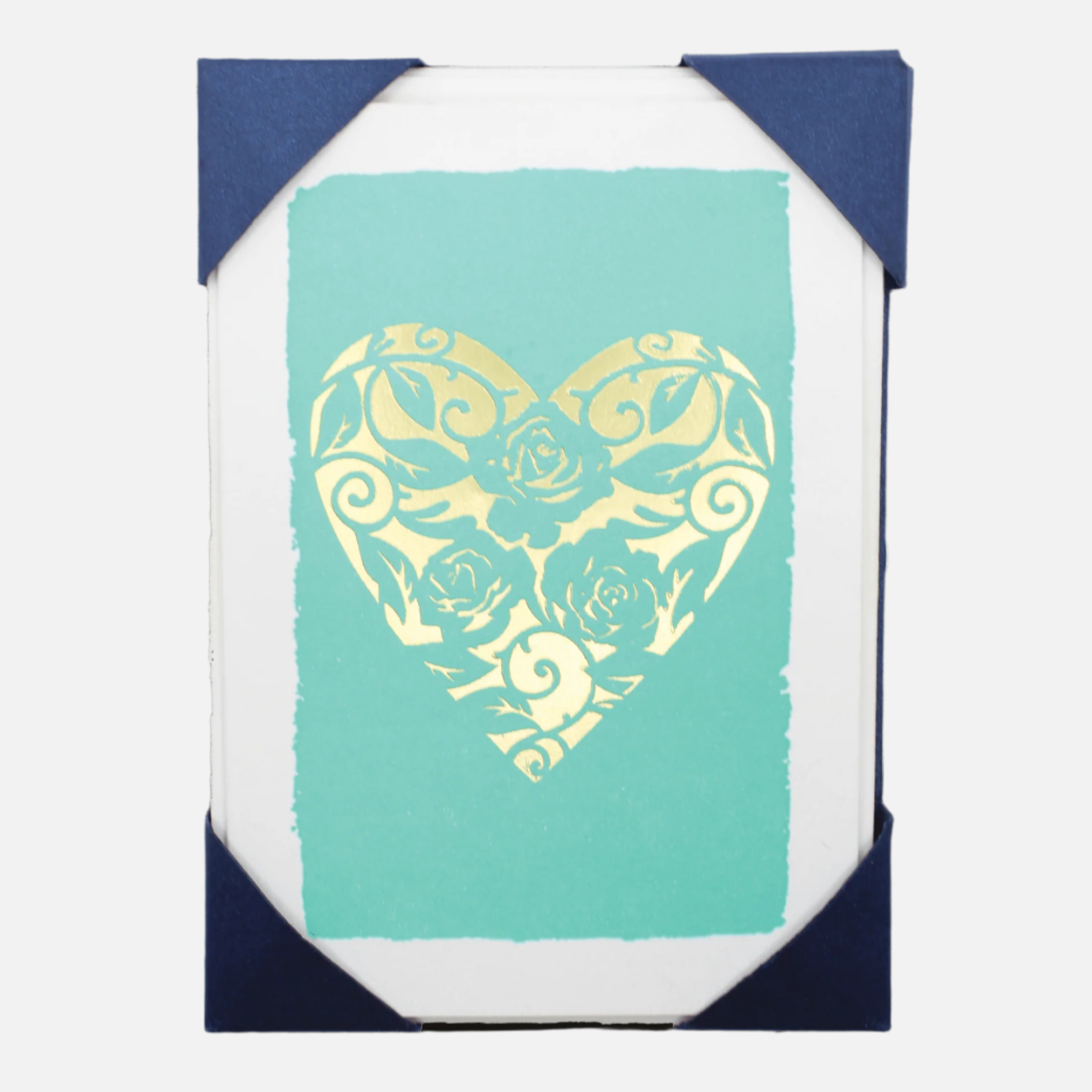 The rose heart is an Archivist Gallery design favourite. Perfect for the love of your life, whether its your boyfriend, girlfriend, husband, wife, life partner or BFF. A beautiful golden design against turquoise blue.