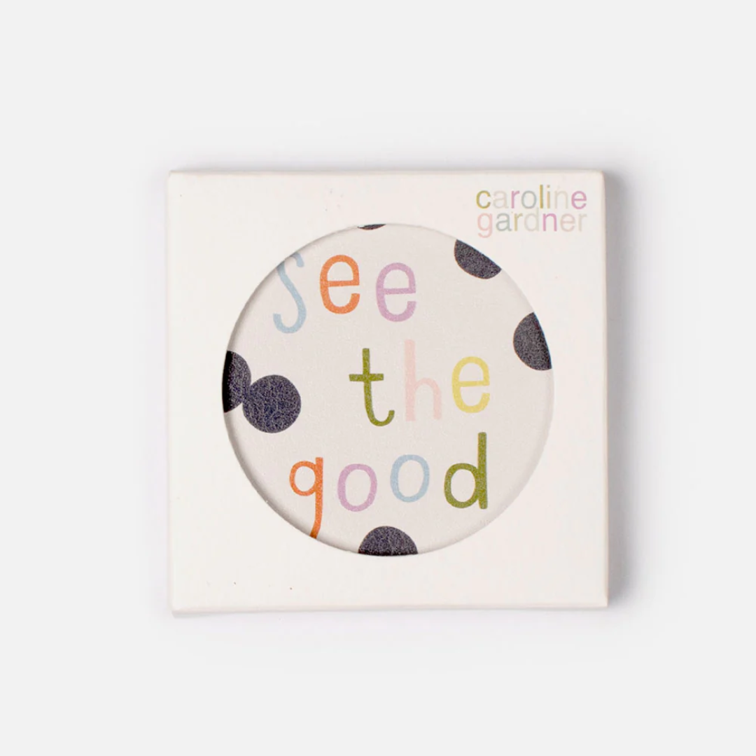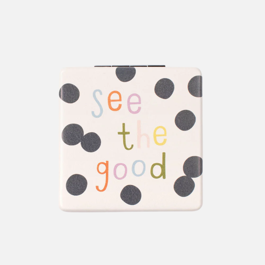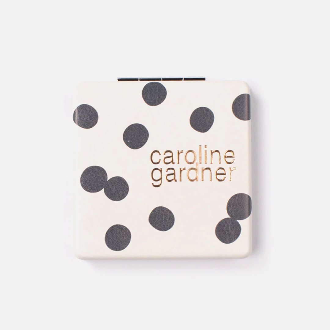 A handbag essential, this Caroline Gardner square pocket mirror features their signature spot design and the slogan "See the good". With two mirrors, one of which magnifying, this the perfect accessory for on-the-go make up touch-ups.