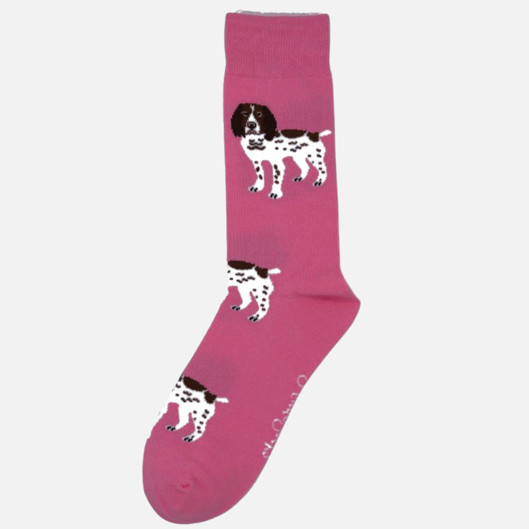 A fantastic pair of socks from Yorkshire-based brand, Shuttle Socks, featuring country bird & animal prints. This lovely spaniel design stands out on the pink background. Made with 80% combed cotton with a terry towelling sole for extra comfort. These gorgeous socks will make the perfect gift for any country lover.