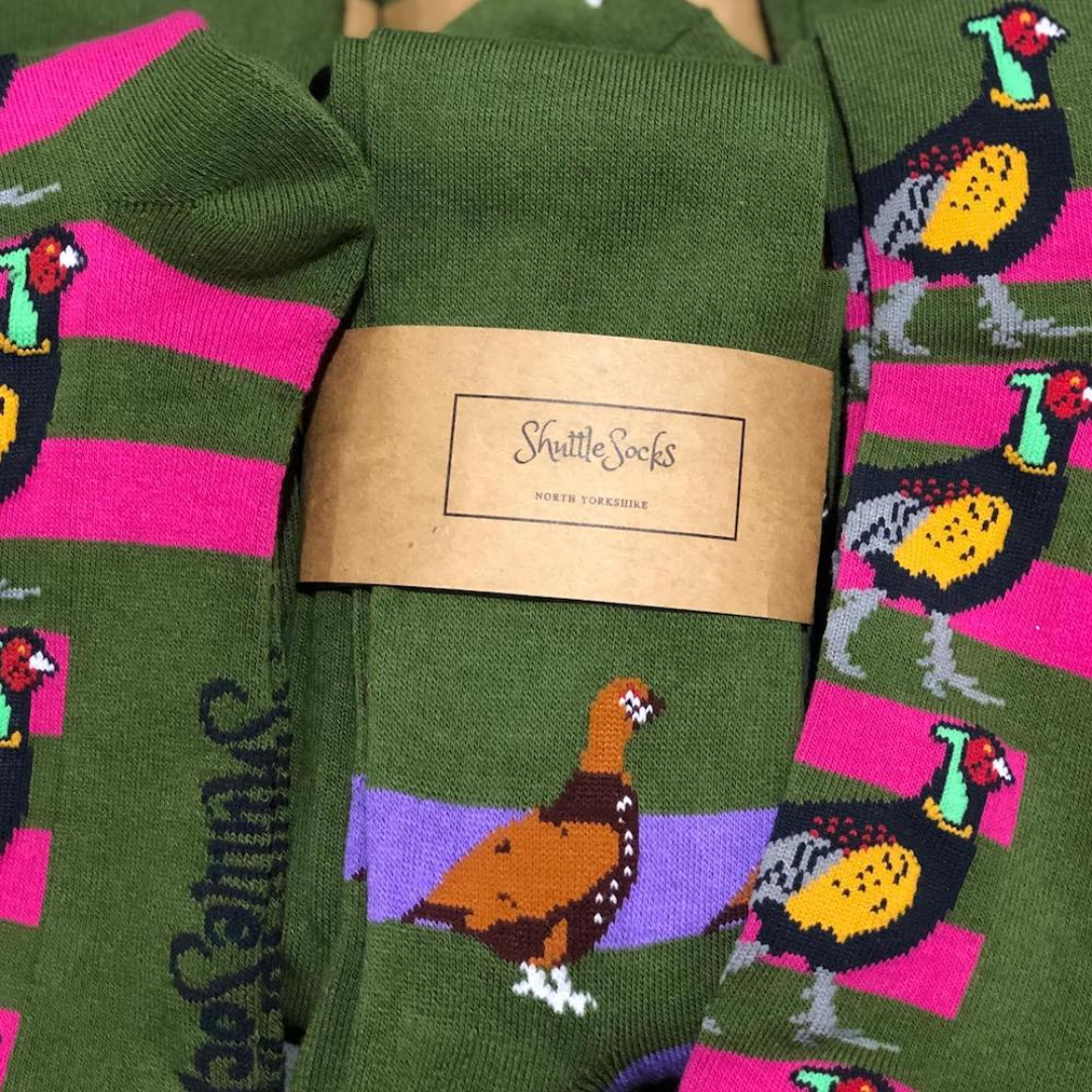 A fantastic pair of socks from Yorkshire-based brand, Shuttle Socks, featuring country bird & animal prints. This lovely pheasant design stands out on the pink & green background. Made with 80% combed cotton with a terry towelling sole for extra comfort. These gorgeous socks will make the perfect gift for any country lover.