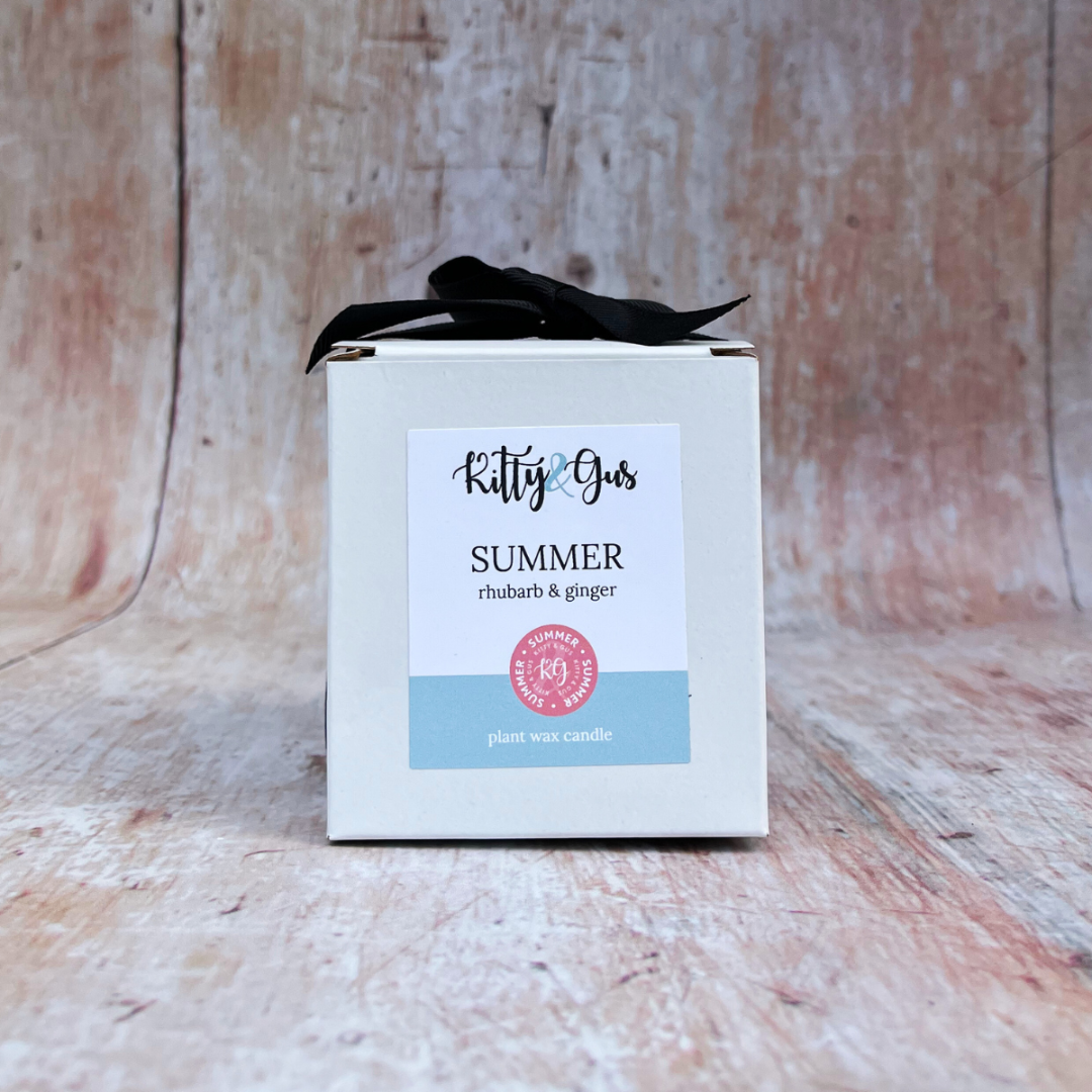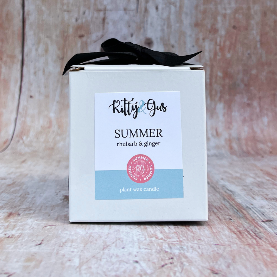 Indulge in summertime festivities and treat your senses with our 20cl 'Summer' Candle by Kitty & Gus. The fruity flair of rhubarb, gooseberry, and raspberry intertwines with the warmth of plum and ginger, finished off with a hint of sweet vanilla. Perfect for capturing the essence of a garden party and sipping on a refreshing gin and tonic.