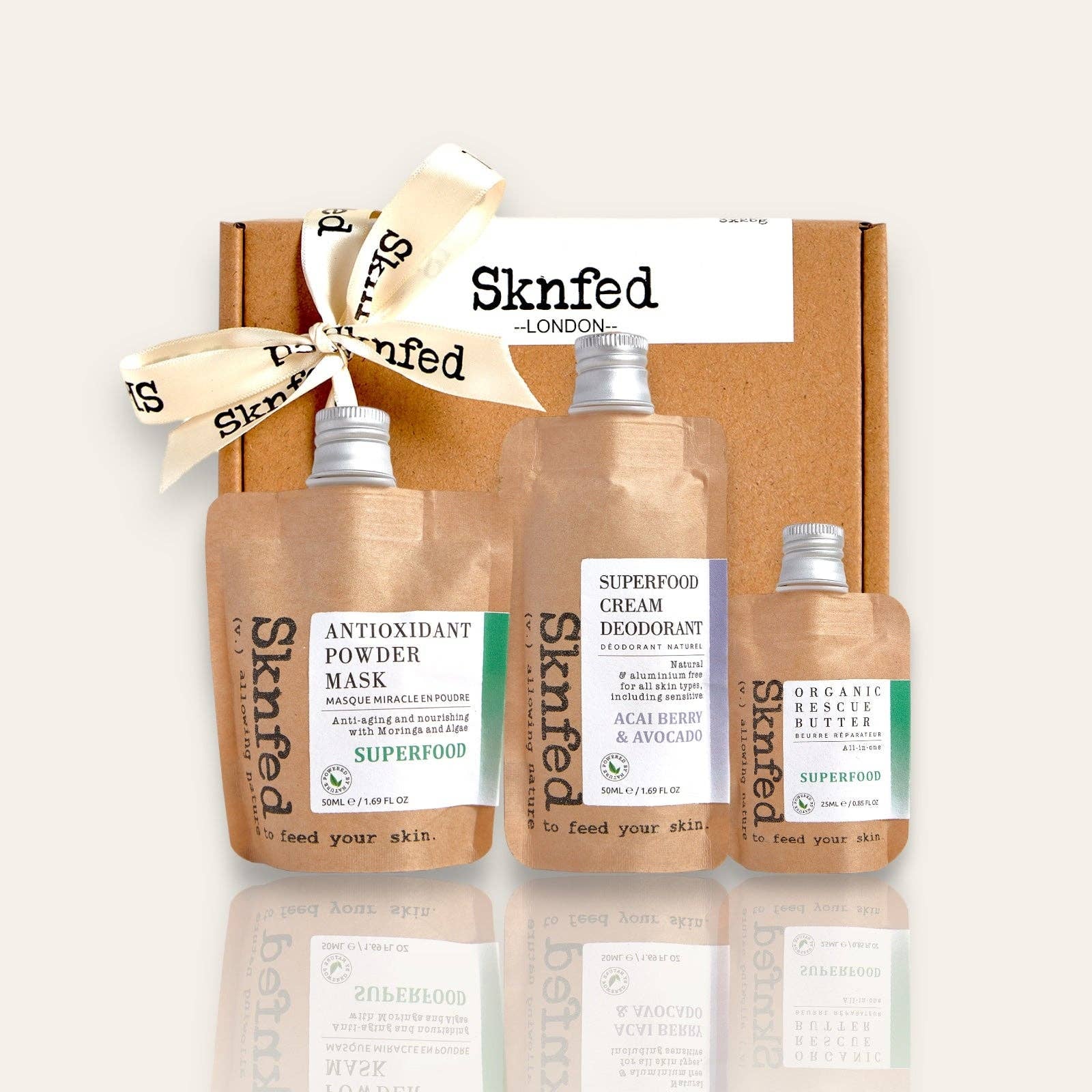 Treat your skin to the ultimate natural nourishment with the Superfood Trio Gift Set by Sknfed. This beautifully boxed collection features three full-size, organic, and vegan skincare essentials, thoughtfully formulated for all skin types. Packed with skin-loving antioxidants, each product helps to balance, protect and rejuvenate for a healthy, radiant glow.