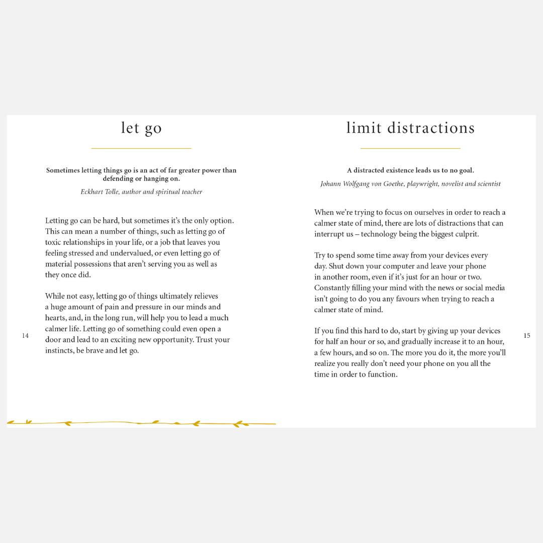 We all know that stress not only makes us unhappy but also has negative effects on our health over time. That's why it's so important to have strategies for returning ourselves to a calm state when we start to feel overwhelmed. From breathing exercises to managing your time and keeping things in perspective, this pocket-sized book is full of practical tips for preventing stress, reducing your anxiety and moving through life mindfully.