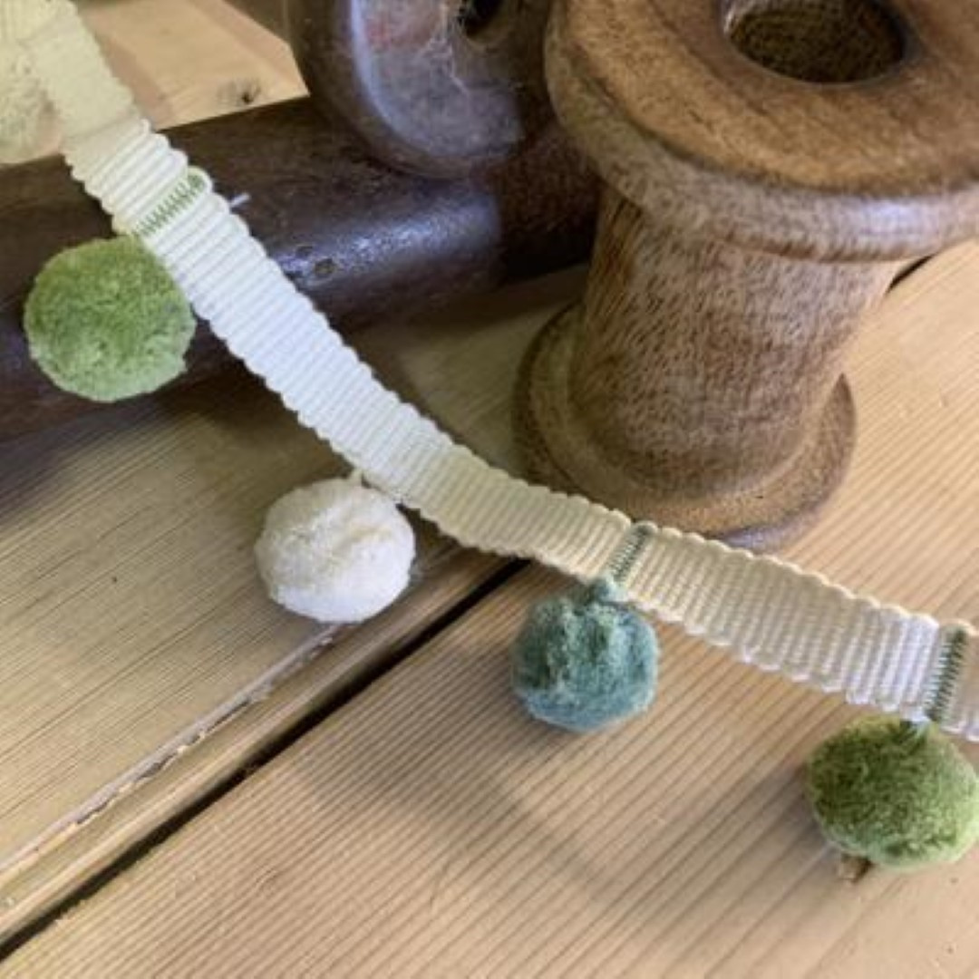 The pretty Tri Colour Pom Pom trimming from Olive & Daisy is perfect for trimming cushions, curtains, blinds, home accessories or craft projects. This trimming comes on matching braid and is perfect to complement their gorgeous range of linen fabrics..