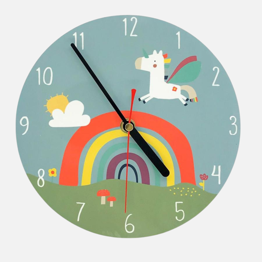 A colourful clock featuring a pretty rainbow and unicorn design. Although not overtly educational this clock sparks the imagination and in turn the beginning of understanding "how to tell the time".