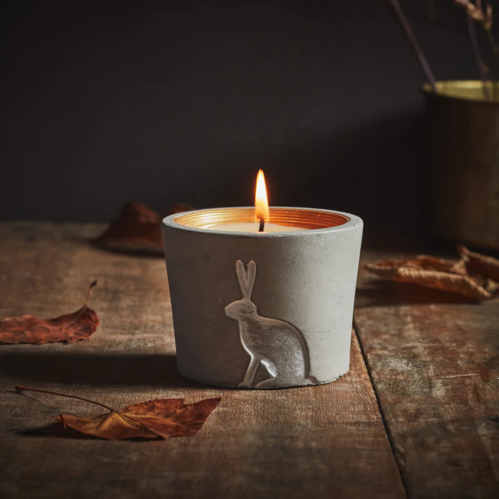 Part of the Winter Woodland Collection, these gorgeous candles are inspired by wildlife surrounding the St Eval farm in Cornwall. Each pretty pot is a soft grey with a dazzling copper gold inner rim, featuring a characterful hare.