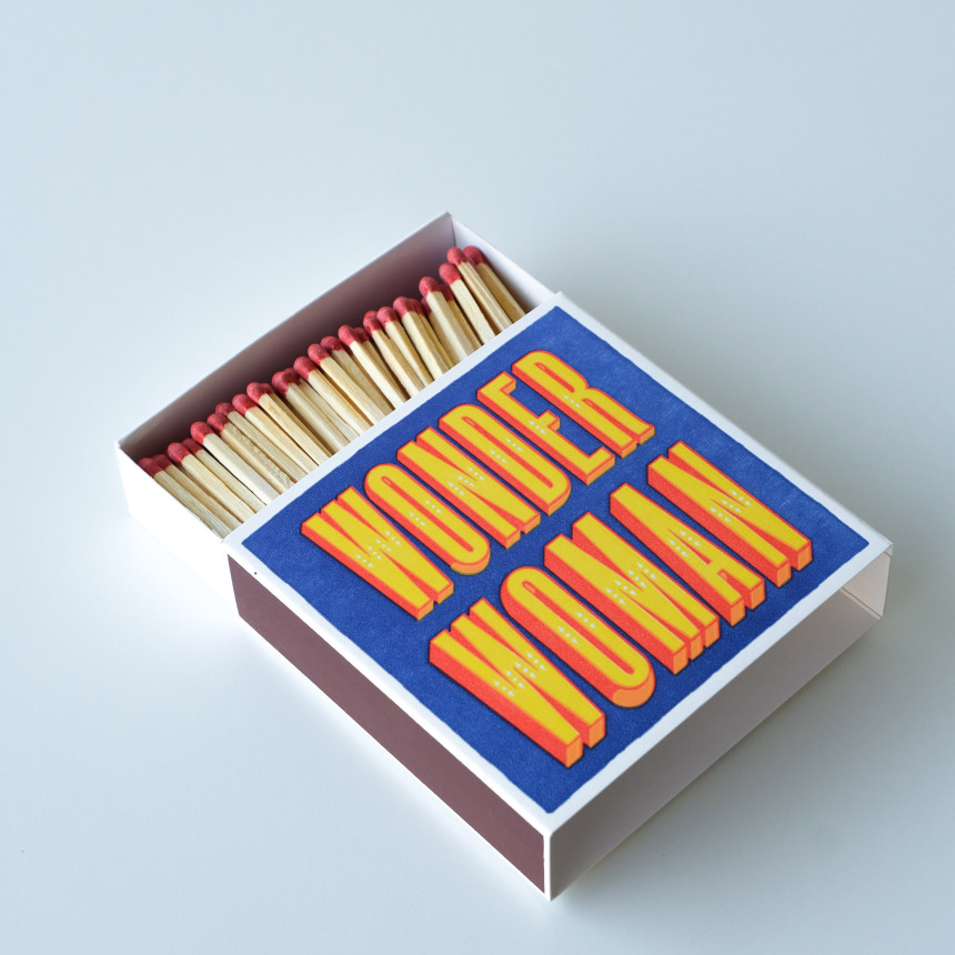 Transform an ordinary gift into something extraordinary with these luxurious "Wonder Woman" matches by Archivist Gallery. Created by Cotswolds resident and letterpress expert, Thomas Mayo, each matchbox is a vibrant burst of energy and colour, using custom letterforms inspired by his collection of vintage wood type. Handmade with playful wooden blocks and vintage printing presses, these matches will bring a smile to anyone's face.