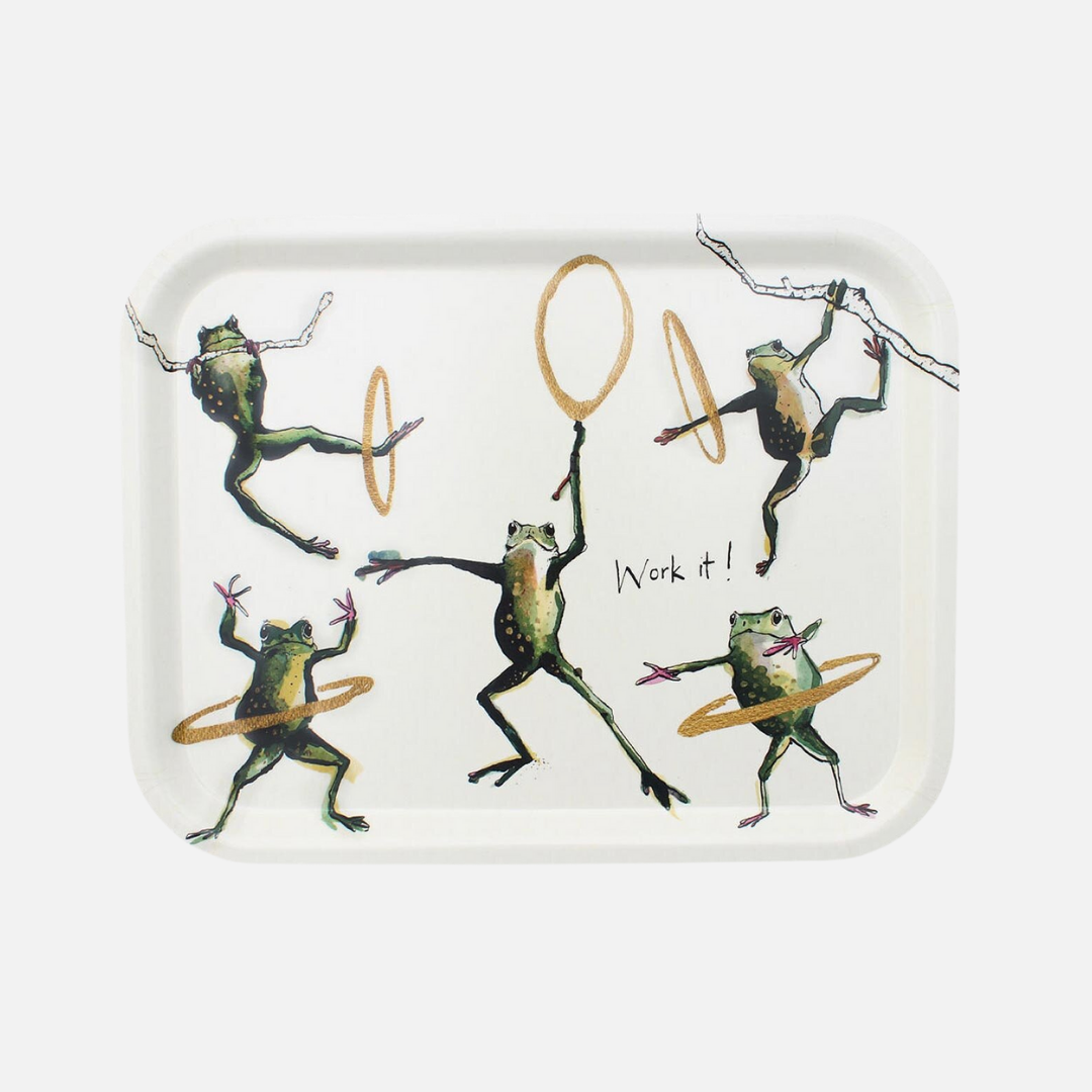 This stunning birch veneer and melamine tray features five, hula hooping, spritely frogs and the handwritten text ‘Work It!’, from artist and illustrator Anna Wright.