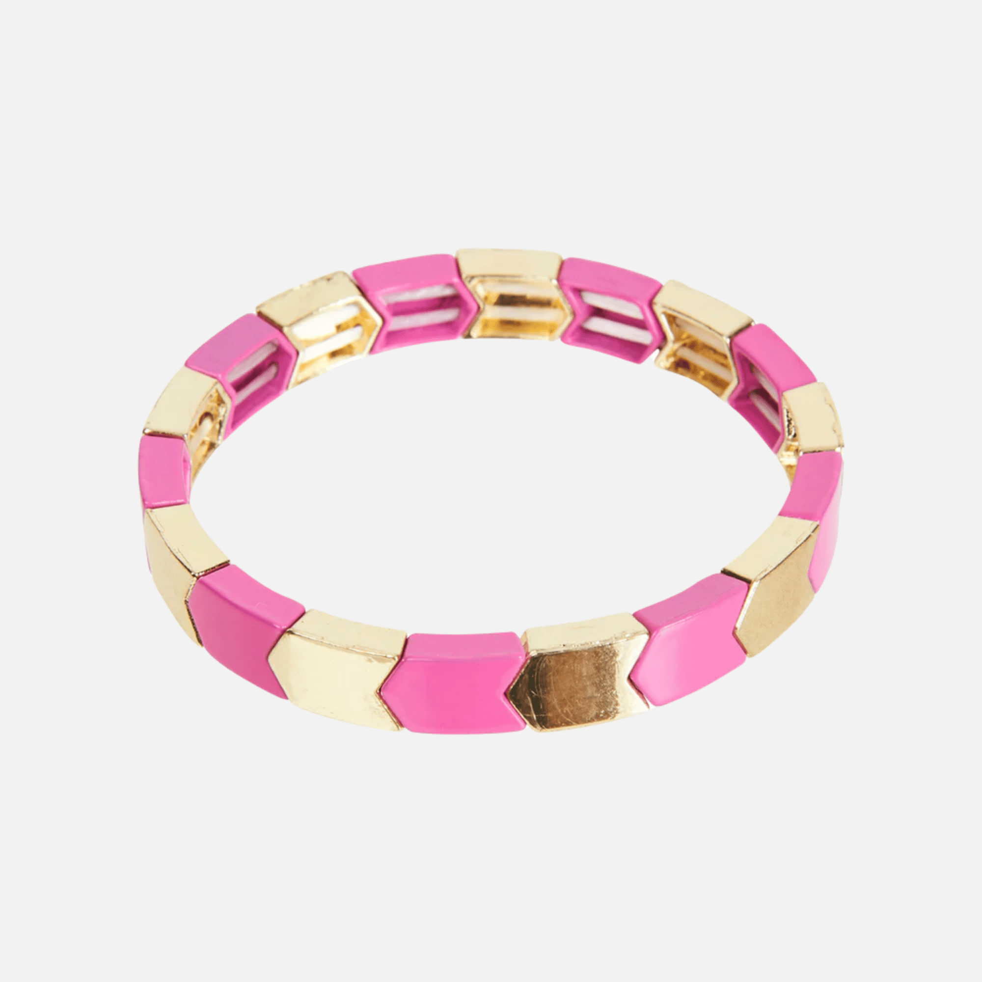 Make a splash this season with the Zephyr Cuff in Candy by Eb & Ive. Featuring a vibrant chevron pattern with shiny gold beads mixed with Candy Pink, this cuff adds a playful and bold touch to any look. Whether you stack it with other pieces or wear it alone, its lively design will instantly elevate your outfit. Perfect for pairing with sleeveless or short-sleeved styles for a warm-weather pop!